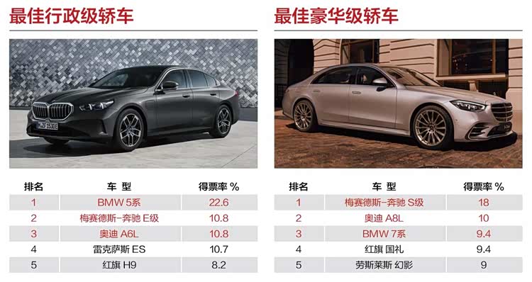 BMW 5系以22.6%的得票率获得“最佳行政级轿车”奖项,同意还是来自德系“BBA”三强竞争,后发制人的5系在这个级别中占据先机,尤其是在2024年第四季度更取得了持续月销过万的市场表现。关于豪华,梅赛德斯-奔驰S级绝对拥有“话语权”,获得“最佳豪华级轿车”奖项的认可更是实至名归,它以全面的豪华表现,定义了豪华级轿车的至臻标准。