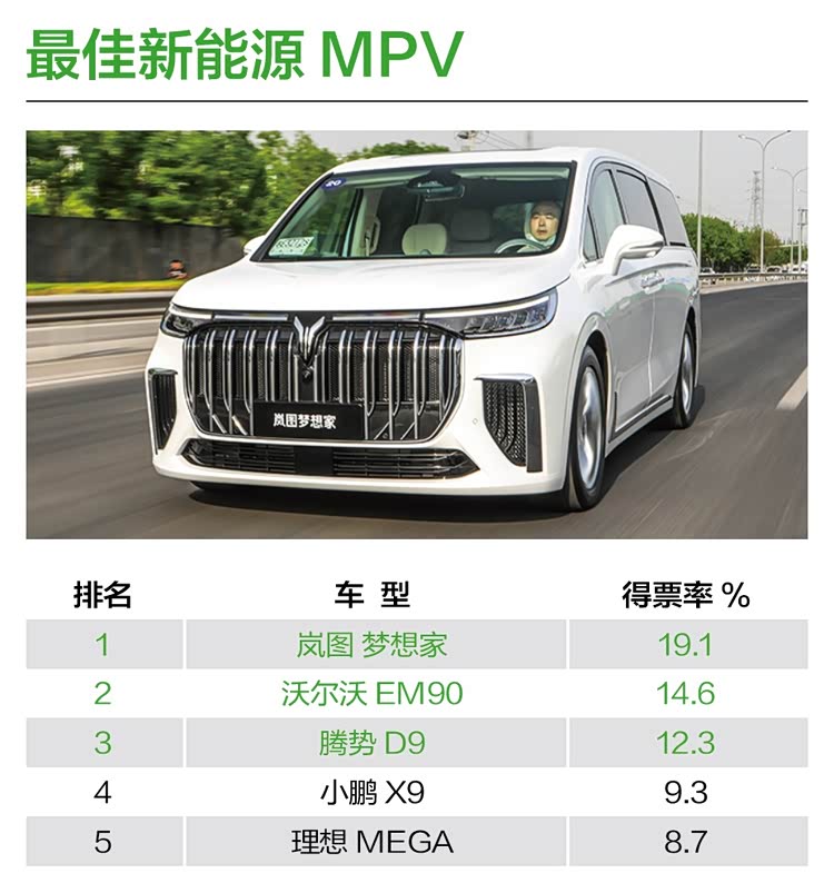 2024年的车市“内卷”,在新能源MPV市场上就有着最鲜明体现,原本小众市场一下子成为各大品牌争相竞争的新战场。伴随着新能源普及,消费者对空间、舒适性和长续航表现的要求就更多,进一步推动了整体需求升级。最终,岚图梦想家以19.1%的得票率赢得“最佳新能源MPV”奖项,除了车型本身的综合素质外,其“冠军首选”所带来的“破圈”影响力,也让岚图梦想家在MPV市场中脱颖而出,建立了新的竞争格局。