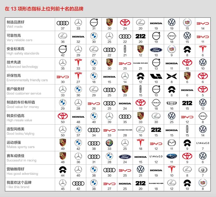 在“风云车2025”品牌大奖中,梅赛德斯-奔驰获得了“技术先进”“客户服务好”“造型风格美”“我喜欢这个品牌”四项品牌大奖,成为最大赢家;BMW获得“制造的车价有所值”品牌大奖;奥迪获得“制造品质好”品牌大奖;保时捷获得“赛车成绩佳”和“运动感强”两项品牌大奖;雷克萨斯获得“可靠性高”品牌大奖;比亚迪获得“环保性高”品牌大奖;沃尔沃获得“安全标准高”品牌大奖;丰田获得“转卖价值高”品牌大奖;蔚来获得“营销做得好”品牌大奖。