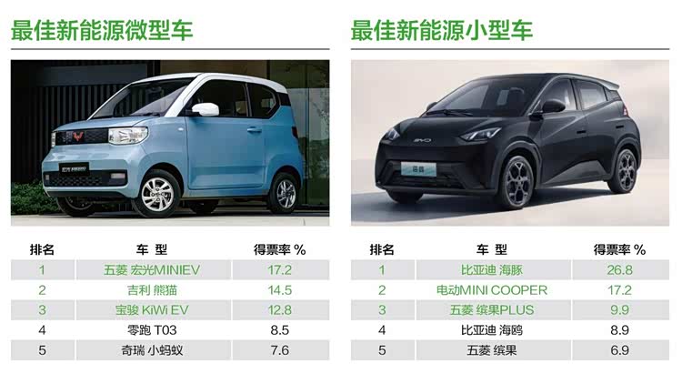 在“风云车2025”新能源车型评选中,五菱宏光MINIEV、比亚迪海豚以17.2%和26.8%的得票率,分别斩获了“最佳新能源微型车”与“最佳新能源小型车”奖项。别看微型车定位“入门”,但现在这一级别车型可都是“麻雀虽小,五脏俱全”,而五菱宏光MINIEV的表现也始终是“现象级”的,这一点从它销量数字上就得到了充分印证。2024年,作为“销冠”的比亚迪绝对算是市场的主角,而作为主打年轻时尚海洋系列的明星车型,海豚凭借全能表现和性价比优势,迅速成为消费市场的新宠,更助力比亚迪在同价位区间内迅速提升了市场份额。