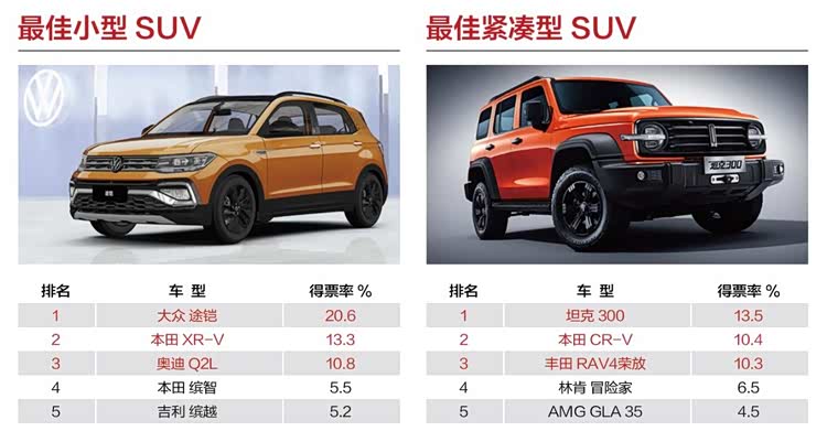 SUV车型方面,上汽大众途铠、坦克300分别获得“最佳小型SUV”与“最佳紧凑型SUV”奖项。其中,上汽大众途铠作为一款主打年轻市场的小型SUV,以20.6%得票率在激烈的同级竞争中脱颖而出,展现出其非常均衡的产品实力;而坦克300自上市起就拥有超高人气,13.5%得票率更是力压一众合资SUV,展现出自主品牌的强大竞争力。