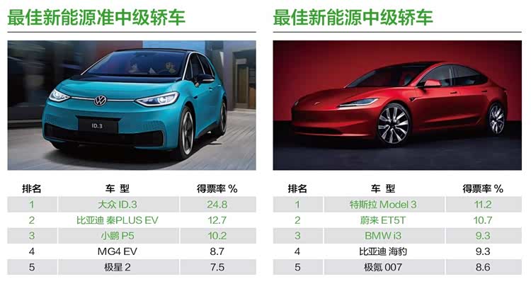 上汽大众ID.3、特斯拉Model 3以24.8%和11.2%的得票率,分别获得“最佳新能源准中级轿车”与“最佳新能源中级轿车”奖项,两款“3”字辈车型的脱颖而出,证明其有着很强竞争力,赢得消费者认可也是在预料之中。作为上汽大众ID.家族中的明星车型,ID.3凭借其出色的产品力和高性价比,成为市场的“爆款”车型,累计销量突破20万辆,成为合资品牌纯电车型中的佼佼者。而同样是作为一款全球车型,特斯拉Model 3在品牌力、充电网络、性价比等方面依然拥有同级车中最具代表性的表现。