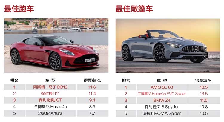 本次“最佳跑车”奖项的竞争十分激烈,阿斯顿·马丁DB12最终以11.6%得票率的微弱优势超过保时捷911获奖,作为一款全新车型完美诠释出自信和纯粹的品牌精神。同样也是一款全新车型,梅赛德斯-AMG SL 63以18.5%的得票率将“最佳敞篷车”奖项收入其中,打开Z型软顶敞篷,尽情享受AMG的性能魅力。
