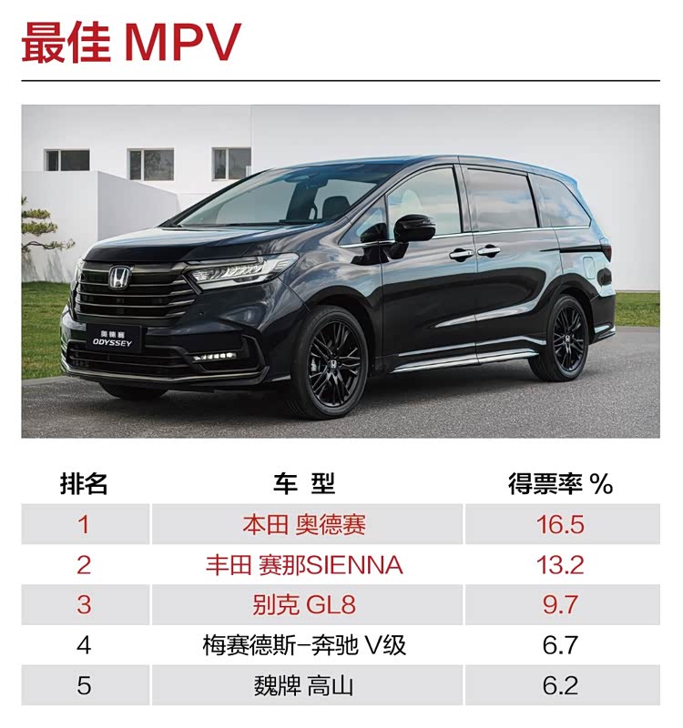 MPV在2024年绝对算是热门市场之一,随着家庭出行场景比重的提升,更符合中国家庭“体质”的MPV尤为引入关注。最终,广汽本田奥德赛以16.5%的得票率力压丰田赛那和别克GL8获得“最佳MPV”奖项,绝对是含金量十足,良好口碑与便捷功能性成为其备受家庭认可的“杀手锏”。