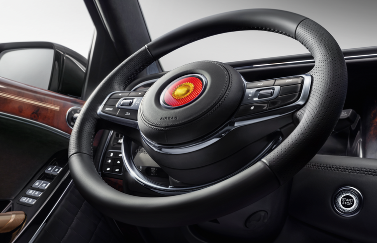 而手握的方向盘更采用了中国传统大门门环的“辅首衔环“的设计,而且这样的设计高度还原了我国第一辆国产车的方向盘,这是向第一辆国产车的致敬与传承。中间的金葵花标志凸显出尊贵和豪华,展现出红旗品牌独有的中式豪华的传承以及中式美学的独到之处。当你手握方向盘驾驶着红旗金葵花国耀时,就像驶过中国汽车工业从无到有的奢华之路。