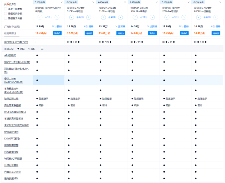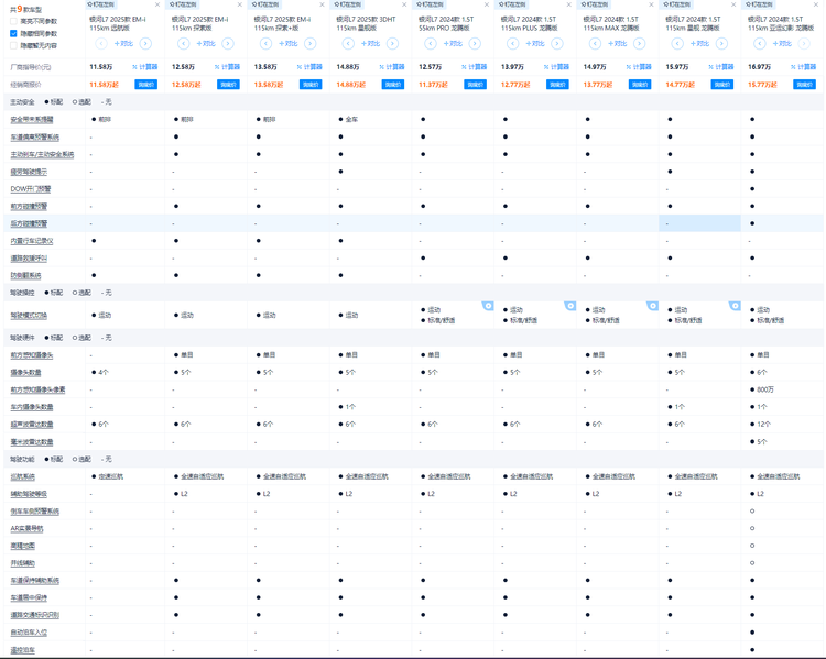 在再来看看银河L7,它的售价是11.58万至16.97万,最低配同样没有L2级驾驶辅助功能,甚至连主动刹车、前方碰撞预警都有,除了最低配车型外,往上车型仅仅也只有L2级智能驾驶辅助,像遥控泊车、自动泊车入位等这些功能,也只有最顶配才有,看完这两款车型的智能驾驶辅助配置和安全配置后,在去看看深蓝S05是不是发现区别挺大的。