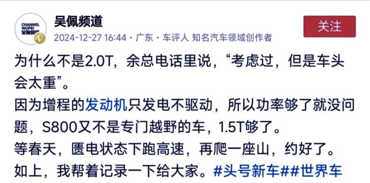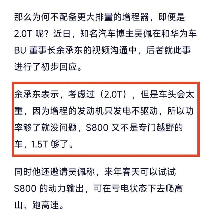 尊界是除了红旗之外的第二家定位超豪华轿车市场的汽车品牌, 尊界S800(参数|询价)将在2月20日正式发布,之前余承东就已经公布预售价是100万,顶配版150万,对标奔驰迈巴赫。有意思的是,最近看到不少人拿东安动力提供的1.5T增程器说事,说什么100多万的车用1.5T,太绝了,最少也要用2.0T吧。对此,余承东在视频通话中回答了汽车博主吴佩这个问题,他说1.5T增程发动机只发电,不用来驱动汽车,S800又不是越野车,1.5T够用。