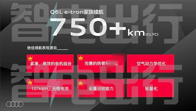 Q6L e-tron提供单电机后驱和双电机四驱动力,配备107kWh三元锂电池组,CLTC工况最高续航750+km;标配800V高压技术,电量从5%充至80%只用23分钟。