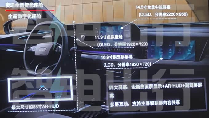 车内配备11.9英寸+14.5英寸曲面双联屏、10.9英寸副驾驶娱乐屏、88英寸AR-HUD,提供中国专属车机互联、数字助手等配置。