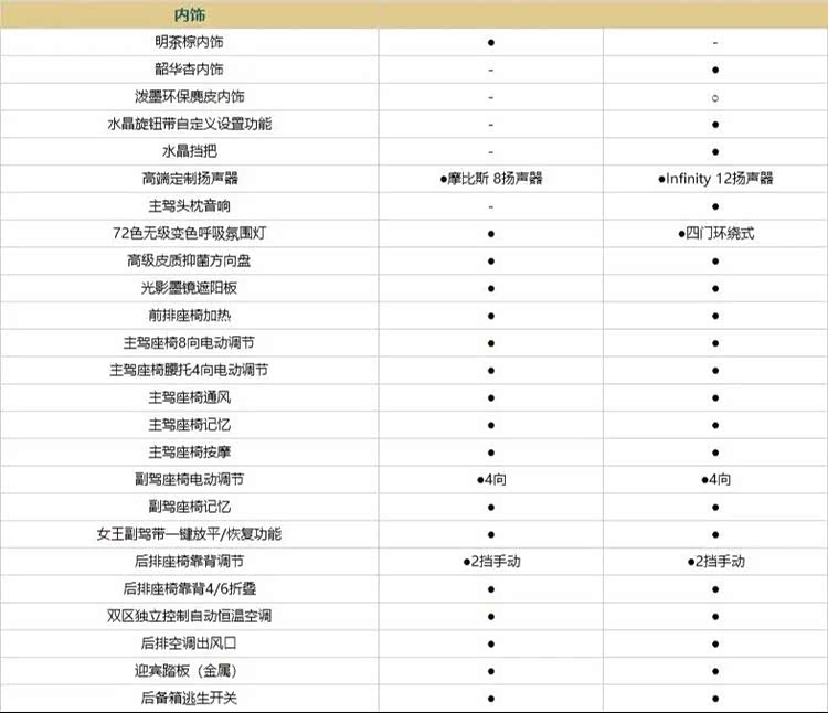 而东方曜·今朝版则采用韶华杏内饰,并可选装泼墨环保麂皮内饰,以及加热包(方向盘加热、座椅靠背加热、后排座椅加热)。其余配置方面,东方曜·今朝版相比行云版又增加了四门环绕式72色氛围灯、水晶挡把、水晶旋钮、12扬Infinity音响系统、主驾头枕音响、AR-HUD抬头显示等。