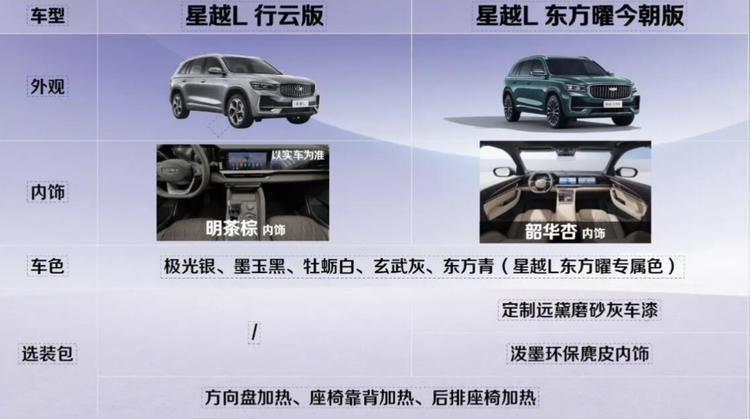 外观方面,新款星越L延续了现款车型的造型设计,其中,长风、行云版采用内凹式前脸,配备19寸轮毂;东方曜·今朝、东方曜·揽星、东方曜·望月版则采用外凸式前脸,配备20寸轮毂。车身尺寸长宽高依旧为4770*1895*1689mm,轴距2845mm,另外也继续提供牡蛎白、极光银、玄武灰、墨玉黑以及东方青(东方曜专属)车色可选。同时,东方曜车型还可选装远黛磨砂灰车漆。
