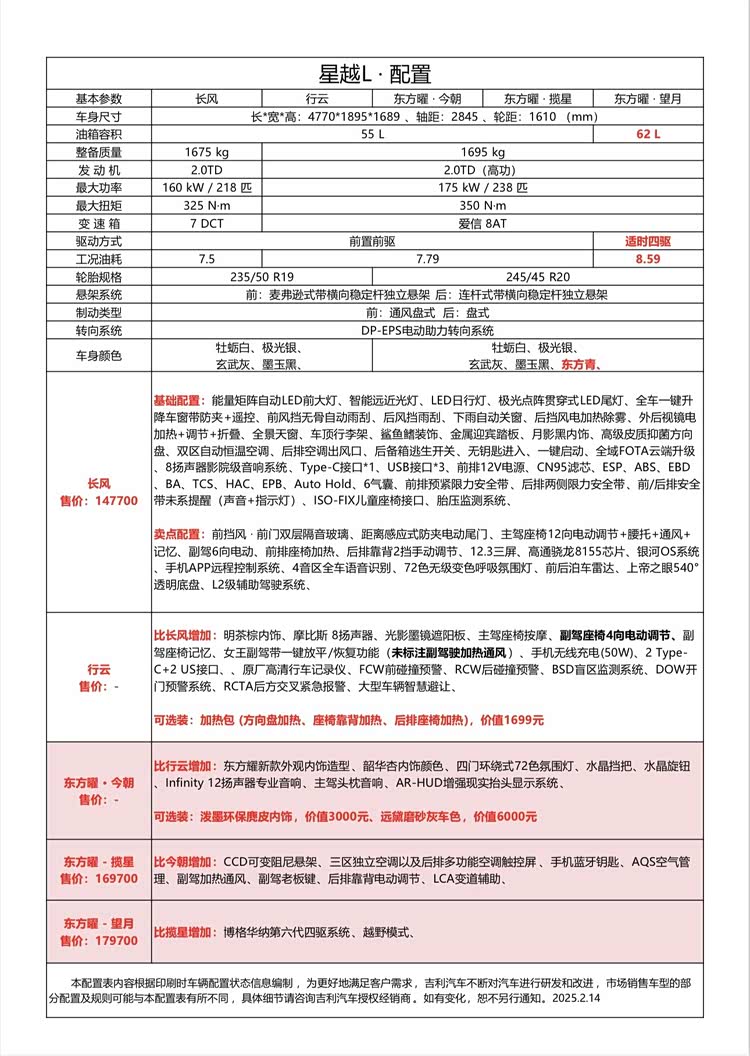 2025年1月,吉利星越L以29434辆的成绩,成功登顶燃油SUV市场销量冠军!如今为了实现更进一步,新款 星越L(参数|询价)前来助力。新车主要针对配置进行升级,并新增行云版、东方曜·今朝版两款车型,从而取代现款的云起版、天际版。日前,已有网友拍到了新款星越L的实车到店图,也就意味着离上市不远了,同时,新车的配置信息也得到曝光,下面我们就来提前了解一下。
