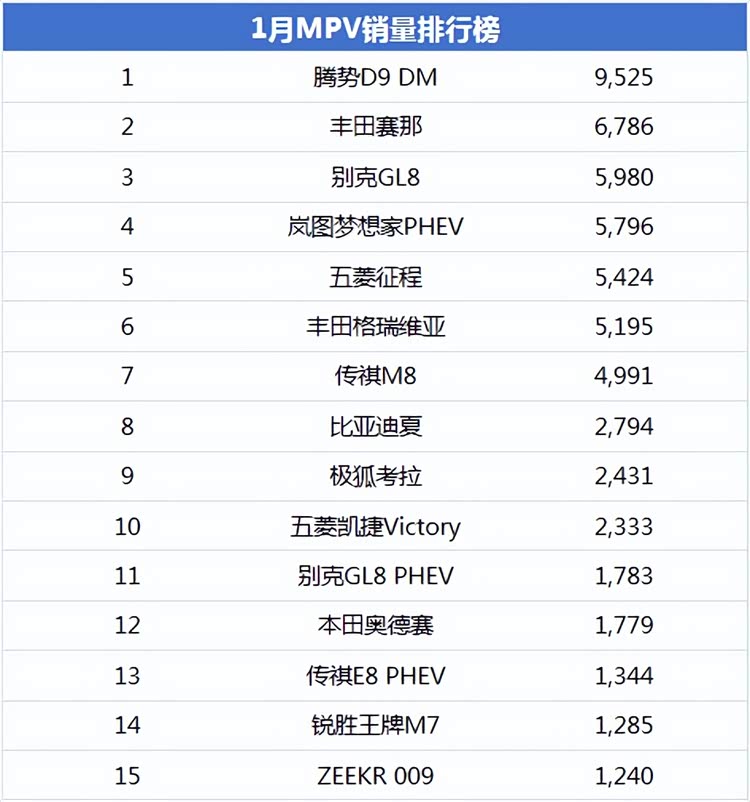 1月MPV市场呈现出了市场集中度高的特点,前15名车型的销量占据了市场的大部分份额。这表明MPV市场的竞争虽然激烈,但头部效应明显,消费者在选择时更倾向于热门车型,而从上榜车型来看,基本都是“老面孔”,大体格局已经形成。