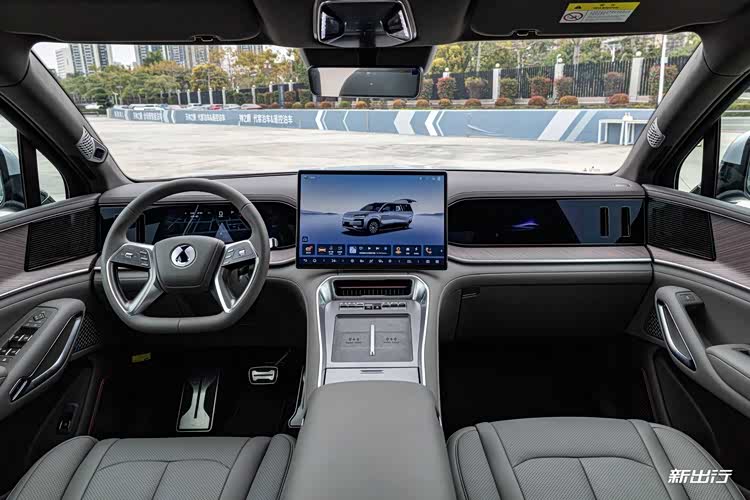 从大内饰图来看,腾势 N9 采用了家族最新的设计风格。当然,在细节方面还是要做出区分的,例如水杯架的位置。
