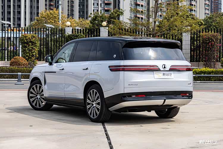 最后来到尾部,能够看到腾势 N9 的尾部视觉效果非常宽大,并且也非常有辨识度。非贯穿式的长条尾灯,在示宽灯状态下很有特色。