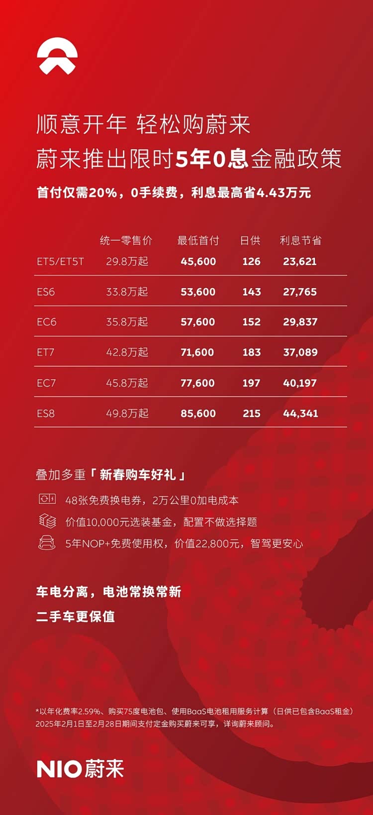 为积极响应国家大力促进新能源汽车消费的政策号召,蔚来汽车特别推出极具吸引力的金融优惠福利 ——5 年 0 息限时金融优惠政策。在 2025 年 2 月 1 日至 2 月 28 日活动期间,用户只需支付定金,即可选购蔚来全系车型(*ET9 除外),并享受超值的 5 年 0 息金融方案。首付低至 20%,而且手续费全免,真正做到让利用户。