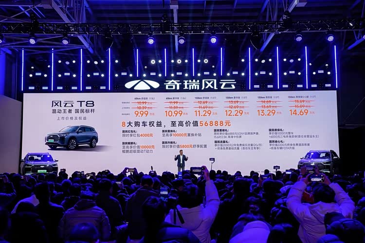 2月22日,奇瑞风云T8正式在青岛全球上市,新车共推出6款版型,官方指导价为10.39万元-15.09万元,限时抢鲜价低至9.99万元起。作为奇瑞风云序列新春推出的首款车型, 风云T8(参数|询价)定位“10万级5+2座超级电混SUV”,这款车承载着奇瑞在新能源领域的最新技术成果,也瞄准了当下消费者对混动SUV的多元需求。