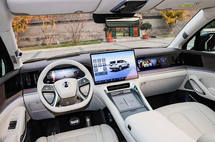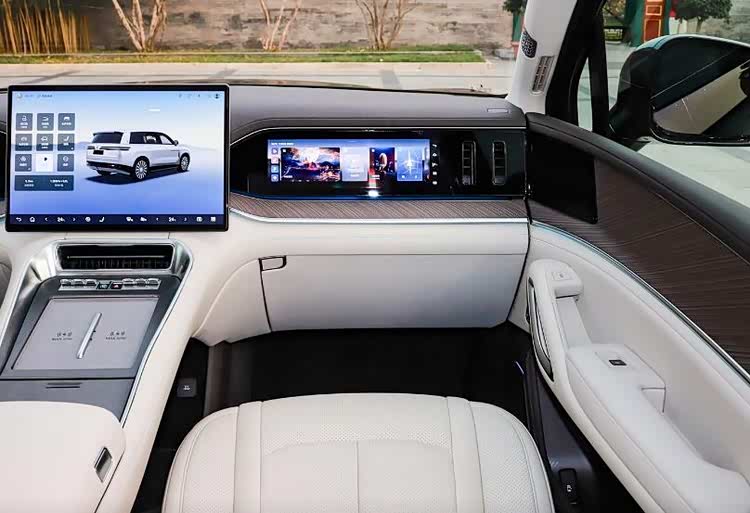 进入车内,新车的内部也是档次感满满,同时科技氛围感也很足。车内中控台上配备17.3英寸中控屏以及两块12.3英寸液晶仪表与副驾娱乐屏,副仪表台区域设计有最大功率50瓦的双手机无线充电面板,并采用全新样式的四辐式方向盘。此外,新车还提供车载冰箱、第二排/第三排双导轨遮阳帘、26个扬声器帝瓦雷音响、电动预紧安全带等。