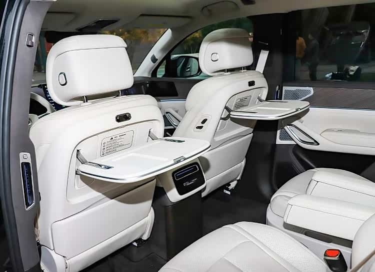 座椅方面,车内采用2+2+2式6座布局,主驾座椅带有主动侧翼功能,副驾座椅提供四向女王腿托;第二排布置有双独立座椅,带有14向电动调节、电动双腿托(4向调节)、双桌板、双50瓦手机无线充电功能。此外,新车还有着50英寸AR-HUD抬头显示、17.3英寸后排吸顶屏、副驾密码手套箱等,配置更具实用性。