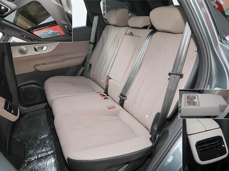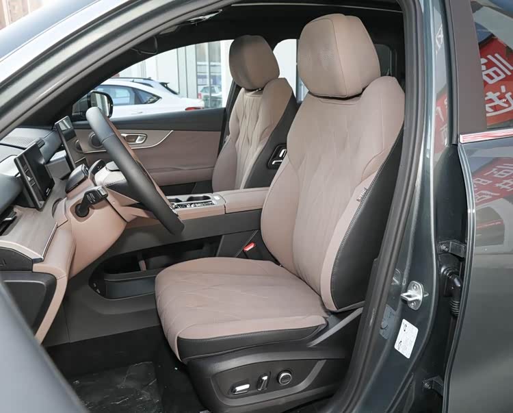 座椅是仿皮材质,表面有丰富的菱形缝线与打孔,填充物软硬合适,与身体贴合度高,还有不错的侧向支撑。这台高配车型,驾驶座除了常规调节,还有4向腰撑调节和记忆,并带头枕喇叭,前排座椅都提供通风与加热。副驾驶座提供女王座,靠背后仰角度很大,还带电动腿托和10点按摩功能,并支持一键零重力,得到高级的享受。侧边也设置了后排可调键。