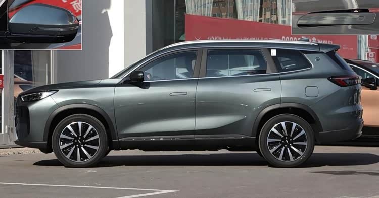 侧面造型修长,前悬适中、后悬很长,显然是为了7座布局而特意加长,不过轴距并不长,车身高度充分。车顶有轻微的下压感,腰线是分段式,其中在后窗底部有显著的外凸棱线,营造出立体的车肩,有利于降低风阻。采用车身同色的粗壮D柱造型,显得结实有力。增加环绕式黑色裙边,但并不粗壮,保留少许的野性。双色外后视镜集成侧转灯和摄像头,门把手为半边弹出式。