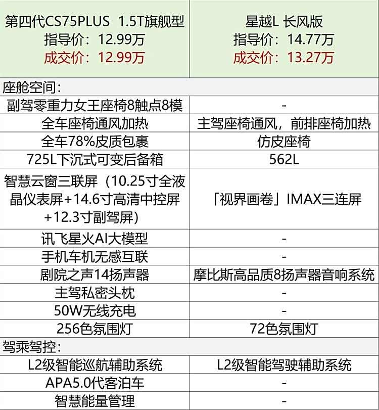 相较之下, 星越L(参数|询价)搭载的是2.0T低功率发动机,配合7速双离合变速箱。虽然起步反应较为迅速,但在持续加速过程中的平稳性略显不足。星越L的综合油耗为每百公里7.5升,且需使用95号汽油,计算下来每公里油费约0.6元,相较之下,日常用车成本明显高于第四代CS75PLUS。若你更看重经济性和长续航表现,显然第四代CS75PLUS更契合家庭使用需求。星越L的性价比有待提高。