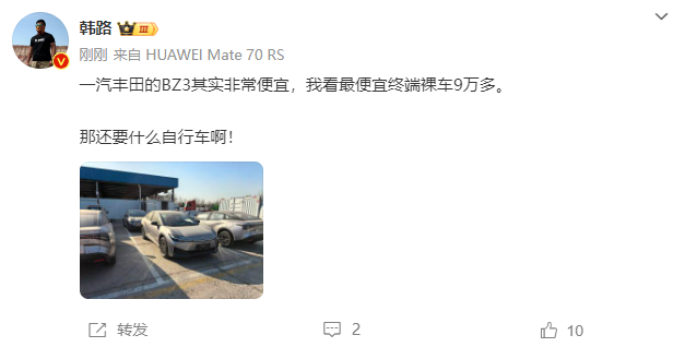 首先还是价格问题,虽然网传丰田bZ3起步价只要9万多了,但这只是个别经销商做活动才给出来的价格,丰田bZ3的正常行情价依然在13.98万起,优惠力度没有网上宣传的那么大,想要更低价格一般都需要长年限贷款才能享有,所以在同价位段这款车依然不是最有吸引力的。