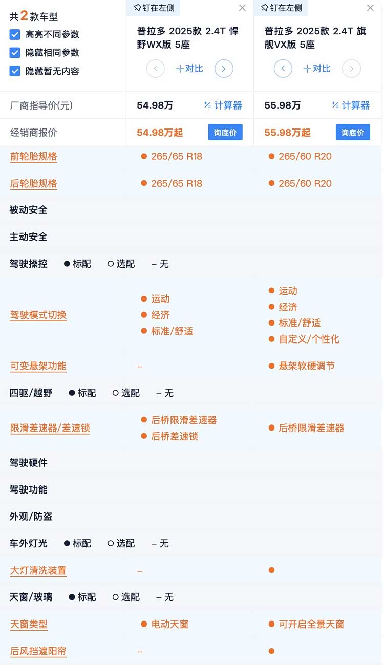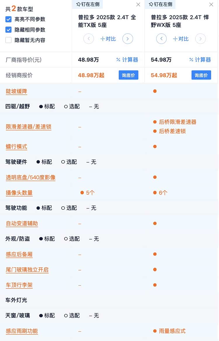 我们再来看新增加的顶配版本——旗舰VX版,这也是此次上市最受人关注的一个版本。那么它都升级了哪些内容?我们就通过与次顶配版本——悍野WX版的比较来寻找答案。
