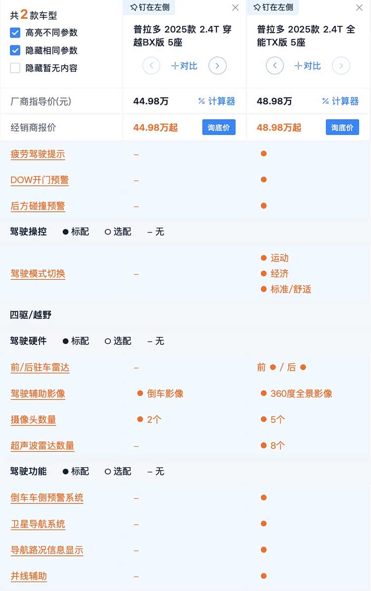 价格来看,穿越BX版售价44.98万,而全能TX版售价48.98万元,两者相差了4万元。那在配置上,最为重要的差别在于驾驶辅助系统。所以全能TX版多出了疲劳驾驶、开门预警、后碰撞预警等功能;同时,驾驶模式还多出了运动、经济和标准模式的切换。