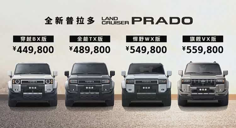 首先,价格来看,2025款普拉多价格区间从44.98万到55.98万元,起售价格较之老款下降了1万元,而且全能TX版更是下降了3万元,新车一共是4个版本,5款车型(其中焊野WX版新增加了5座版)。除此之外,2025款普拉多还增加了旗舰VX版。整体来说,就是价格进一步下探的同时,2025款普拉多的选择也更多了。