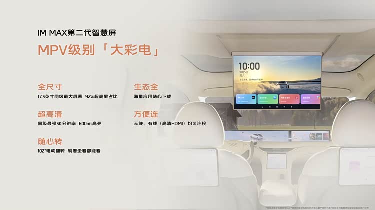 “MPV级大彩电”IM MAX第二代智慧屏全系上车是“升舱”的一大亮点,与LS6独有的“零重力、贵妃椅、大床房”三躺模式绝妙搭配,拓展出百变空间,坐着躺着观影都舒服,实现“移动头等舱”的娱乐自由。同级最大17.3英寸3K高清屏幕,联动全车21个扬声器打造的WANOS 7.1.4 全景声场,打造剧院般沉浸视听享受。作为全能座舱,它既是带娃神器,又可以化身双人浪漫的私享影院;露营时,K歌房或Switch游戏空间自如切换,快乐翻倍;甚至紧急会议时还能投屏移动办公,每一位成员的需求都能得到充分满足。