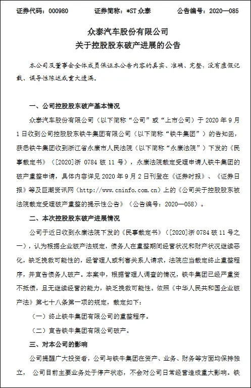 早在2020年,众泰汽车母公司铁牛集团因资不抵债而申请破产重整,连带众泰陷入债务危机。