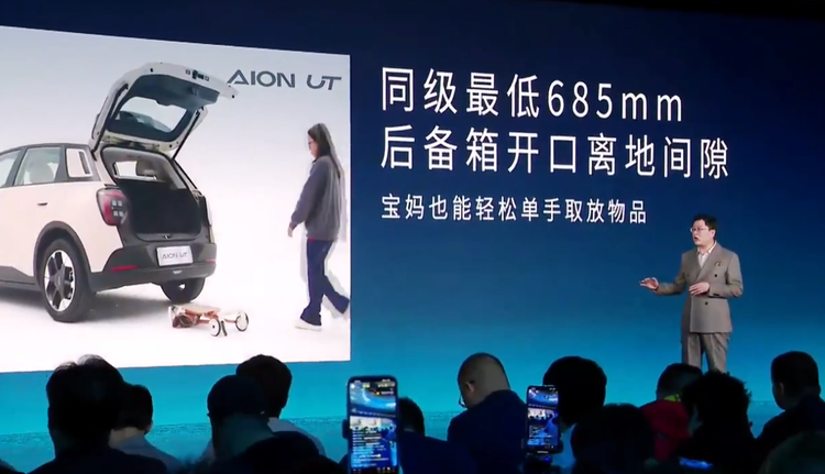 埃安UT拥有4270mm车长,2750mm轴距,优于同级车型,也带来更宽敞的空间表现,并且后排地板纯平,加上1850mm车宽,乘坐舒适性更高。在此基础上,埃安UT常规后备箱空间440L,最低685mm后备箱开口离地间隙,储物能力更强,取放物品也方便。
