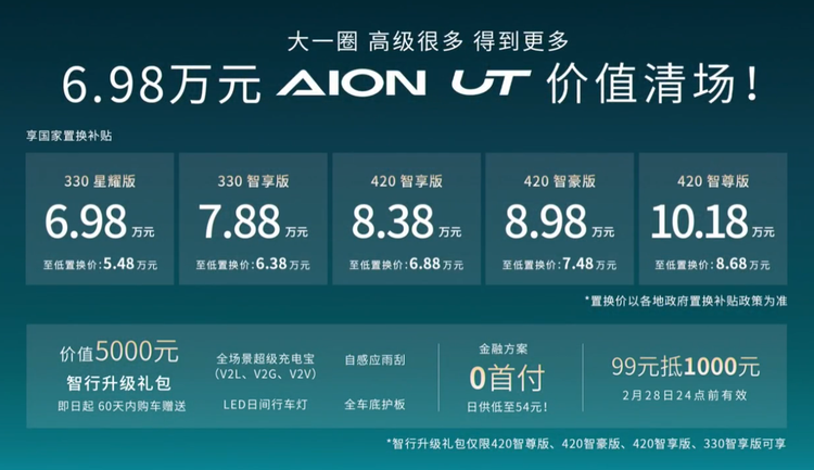 2月28日,埃安UT正式上市,售价:6.98万元-10.18万元,国家置换补贴价:5.48万元-8.68万元。