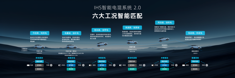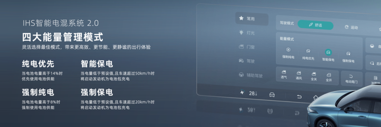 新升级的IHS智能电混系统2.0,遵循“纯电优先,高效用油”的工作原理,智能匹配六大工况,用户无需手动设置,车辆会根据用户的驾驶特性在节省能耗和保证动力之间找到最理想状态。而为了更好的适应不同的用车场景,用户也可通过切换四种能量模式,来满足更高效的、更节能、更舒适的出行体验。
