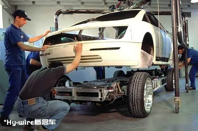 关于“滑板底盘”最早可以追溯到2002年。在当年的北美车展中,通用汽车发布了一款名为“Hy-wire”(Hydrogen drive-by-wire)的概念车。这台概念车为氢燃料电池车,并将此前已经应用于航空领域的“fly by wire”线控技术与汽车进行了结合。所以与传统汽车相比,这款“Hy-wire”概念车大幅简化了加速、制动以及转向等部分的机械结构,把上述的车辆系统全部转为电子控制。理论上讲,驾驶员可以仅通过一个按钮或一个滚轮实现车辆的控制。而得益于这款车底盘的高集成度和平整度,以及车身与底盘的解耦设计,让它看起来非常像是一块光滑的滑板,所以也就诞生了如今的“滑板底盘”概念。