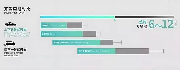 在造车如此内卷的今天,“滑板底盘”诞生最大的意义就是可以让一家车企实现对用户需求的快速响应,对品牌快速丰富产品线起到决定的帮助。此前在采访中,悠跑科技创始人李鹏曾对媒体表示:“滑板底盘”不仅可以大幅度缩短车企推出新品牌的周期,而且可以降低研发成本。“车身与底盘一体的新车研发周期长、难度高,而‘滑板底盘’将上下车体分离解耦开发,可以在更短时间内研发更多车型。”而根据官方公布的数据来看,基于悠跑科技UP超级底盘进行研发的车款,可比传统同平台全新车型开发周期缩短6个月至12个月,研发成本最多可降低60%。