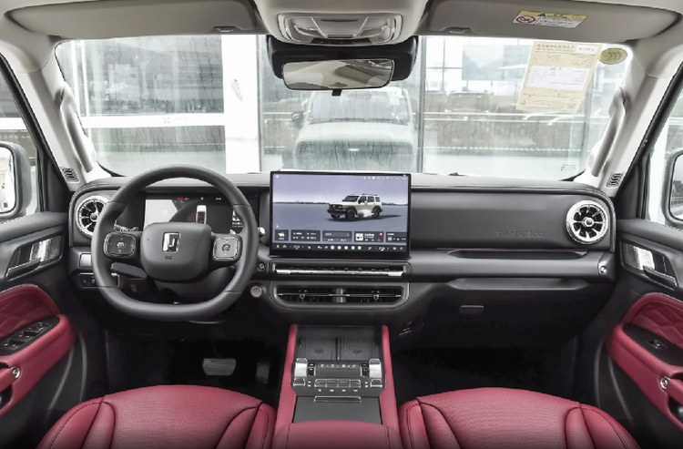 其次在内饰部分,25款坦克300采用了最新的设计语言,例如以往嵌入式的双联屏改为一块液晶仪表和一块14.6英寸的悬浮式中控屏,整个内饰的风格更偏向于新能源车。不仅如此,方向盘的造型也更简约,双辐式的造型,以及底部平底式的设计,再加上电子怀挡为副仪表台腾出更多的空间,基本都在向实用性发展。除此之外,车机内部采用了骁龙8155芯片,同时车机系统采用了长城自研的咖啡OS 3.0,整体操作起来的流畅性,以及内部的功能性都要比以往更为丰富,整体表现同样是更接近于新能源。