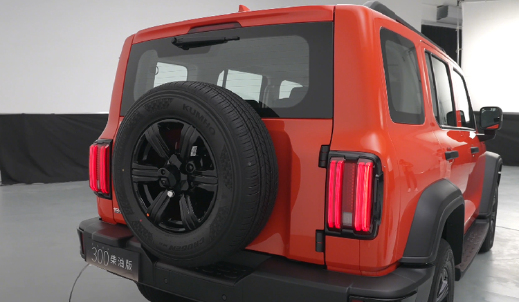 不过来到车身尾部之后,你会发现25款坦克300的外挂式备胎没有了轮辋区域的轮毂罩,所以从视觉角度上来看,也要比现款更粗犷一些,更能提升整车的硬派风格。除此之外,25款坦克300新增了米色系的车身涂装,整体的风格更贴合沙漠之类的环境,而且类似的配色在福特烈马上也有。