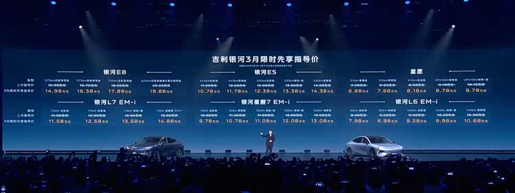 吉利银河L6 EM-i于2月12日上市,3月继续延续2月的限时指导价,提供5款车型,指导价区间为7.98万至10.68万元。购车政策包括限时享不限品牌4000元置换补贴(限140公里长续航车型)、价值至高7845元金融补贴或8万24期0息等。动力方面,银河L6 EM-i搭载1.5升发动机和全新一代雷神电混系统,发动机最大功率82千瓦,驱动电机最大功率160千瓦。电池组容量有8.5千瓦时和19.09千瓦时两种,CLTC纯电续航里程分别为60公里和140公里。