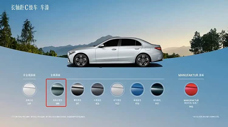 在颜色的选择上,2025款的改款奔驰C级车型采用了绿砾石银色的漆面,同时去掉了贝母白色的漆面。尽管如此,消费者仍有8种车漆可供选择,其中MANUFAKTUR熔岩红色(一种亮丽耀眼的颜色)漆面可通过选装方式获得。