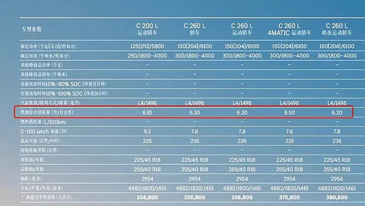 值得注意的是,在WLTC工况下,2025款改款奔驰C 200 L运动轿车的油耗已经从原来的6.35升/百公里降低到了6.10升/百公里;C 260 L轿车/运动轿车以及C 260 L皓夜运动轿车的燃油消耗已经从之前的6.45升/百公里减少到了6.20升/百公里;C 260 L 4MATIC运动轿车的燃油消耗已经从之前的6.75升/百公里减少到了6.50升/百公里,这使得其油耗表现更为卓越。
