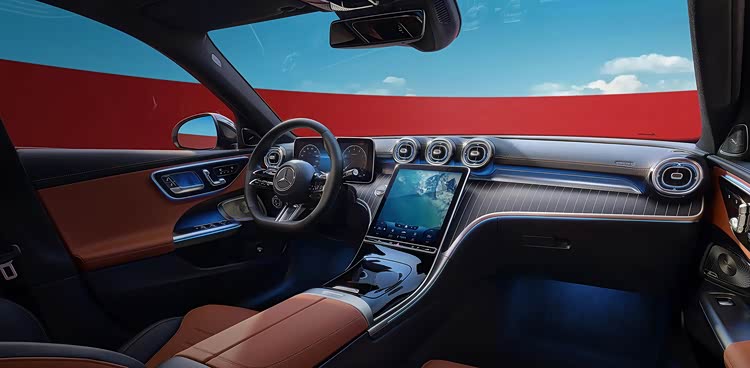 2025款的改款奔驰C级车型在进入车内后,仍然选择了悬浮式全液晶仪表屏和竖向中控屏的组合方式,展现出浓厚的科技氛围。