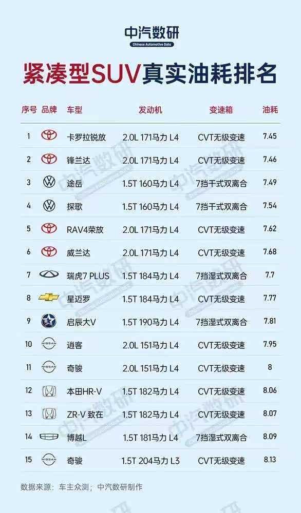大部分消费者在进行购车时,除了关注整车的产品表现之外,对于车辆的经济性也有较多的考量,近期中汽数研最新发布了紧凑级SUV真实油耗排名数据,我们也得以窥见当前主流车型在燃油经济性上的真实情况,接下来我们就来看看前十名车型的表现吧。