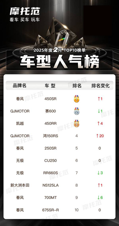 首先登场的是车型人气榜,也就是谁是本月“流量担当”。2月人气榜可谓神仙打架,各路车型你追我赶,场面“内卷”程度直逼手机发布会。先来看榜首之争:上月还你追我赶的仿赛双雄——QJMOTOR赛600和春风450SR——本月依旧牢牢占据C位。不少网友戏称:“赛600和450SR这对冤家又在榜单上掰手腕,谁也不让谁,简直YYDS!”两款车一个凭借大排性能,一个主打性价比,都拥有大批死忠粉。结果呢?赛600略胜一筹蝉联人气冠军,但450SR也紧随其后稳居第二,“顶流”宝座你方唱罢我登场,热度拉满。