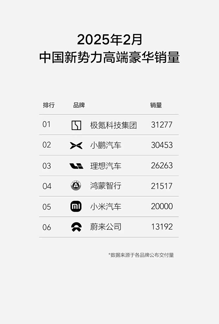 它就是极氪科技集团。公告显示,2月,极氪科技集团交付31,277台,成功领跑中国新势力高端豪华市场;其中,极氪品牌交付14039辆,相比去年同期大涨86.9%,较上月环比增长17.6%;领克品牌销量为17238辆,同比增长也高达30.5%。