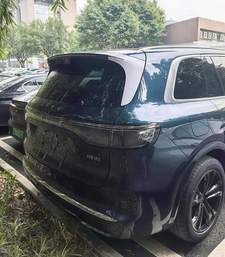 其三,前脸设计焕然一新。问界M8虽然沿用了家族式的贯穿式灯带设计,但整体造型与问界M9、问界M7形成了鲜明的区分。高耸的前舱盖线条赋予了车辆更强的肌肉感,使得问界M8在问界家族中独树一帜。车尾部分则与M9高度相似,贯穿式尾灯内置点阵像素光源,支持动态灯语交互,夜间行驶时辨识度极高。