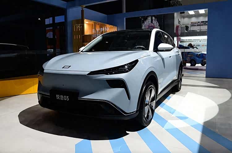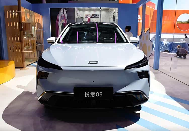 再说颜值。悦意03基于越影平台开发,外形圆润饱满,进一步降低整车风阻系数,优秀的空气动力学设计让其风阻只有0.248Cd,这对续航能力有所提升。采用封闭式前脸,并搭配分体式大灯,前杠设计有大尺寸进气口,上方配有镀铬装饰条。