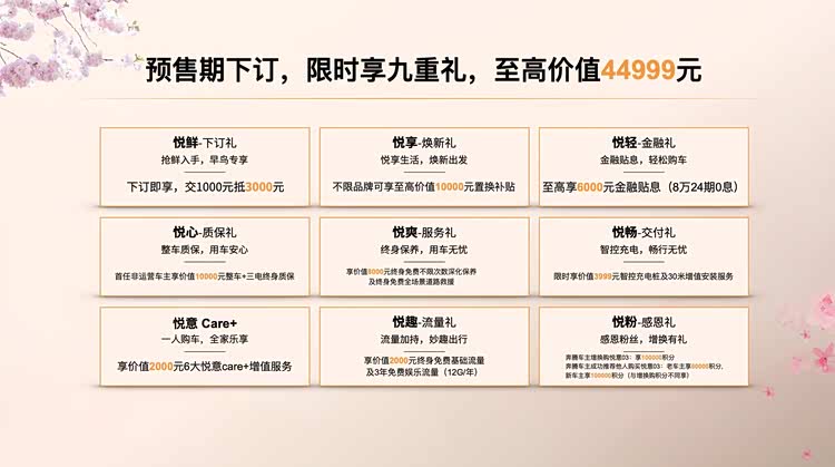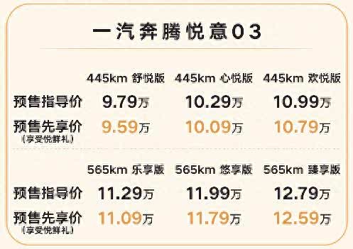 3月5日,一汽奔腾旗下悦享城市纯电SUV——悦意03正式开启预售,共推出6款车型,预售指导价9.79万-12.79万元。新车在开启预售的同时下订还可直接享受2000元现金优惠,预售先享价仅为9.59万-12.59万元。