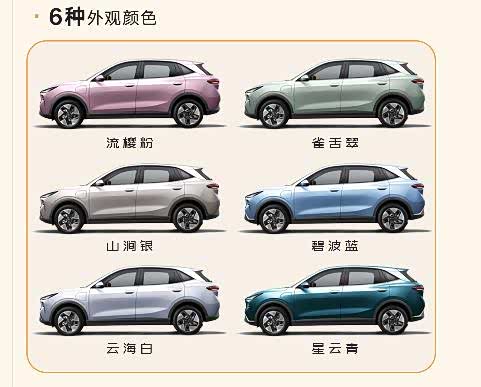 悦意03一共有六种车身颜色,除了在直播间内让人眼前一亮的流樱粉之外,还有雀舌翠、云海白、碧波蓝、山涧银、星云青五种颜色。另外悦意03内饰的颜色也是非常的丰富,共有翠羽青、青花蓝、云锦灰三种颜色。